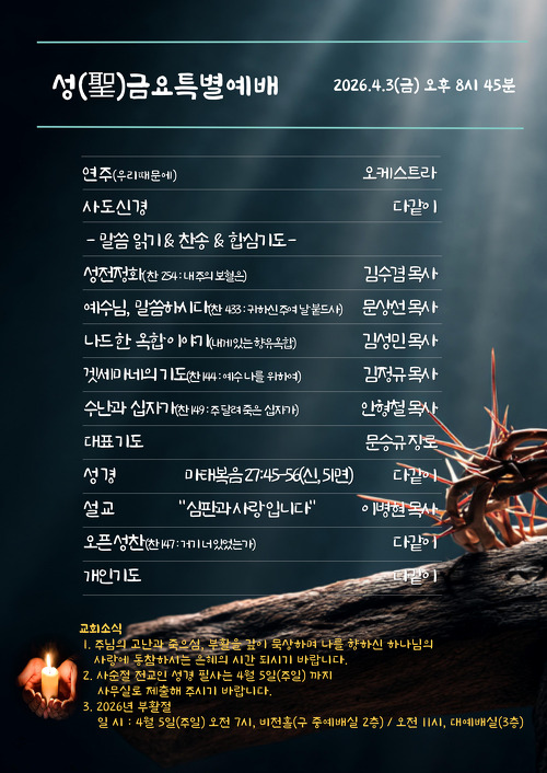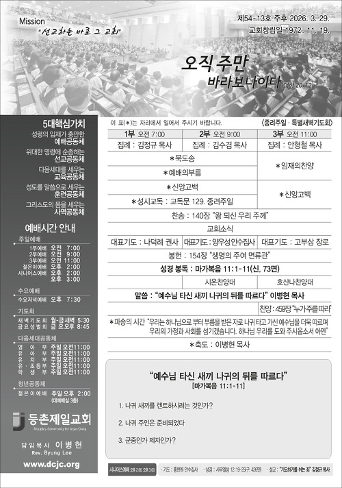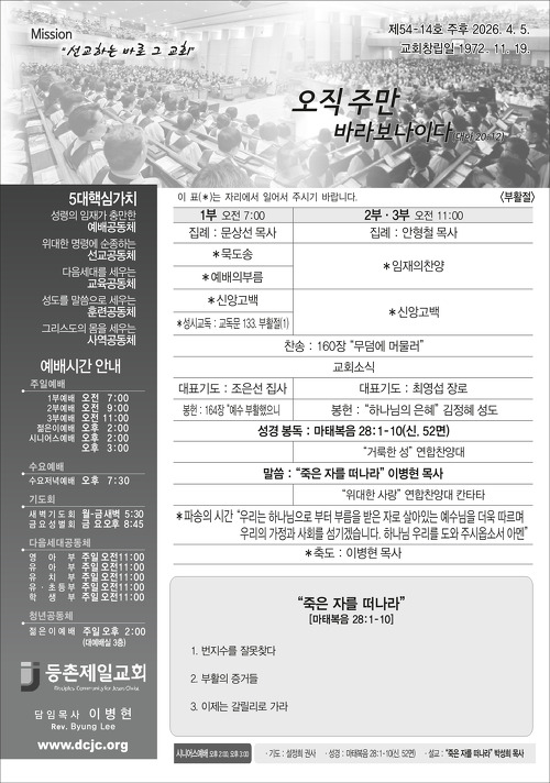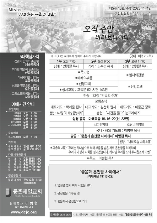 본문영역바로가기 About Us 하나님의 뜻과 함께하는 등촌제일교회 등촌제일교회는 1972년 창립되어 낙도와 농어촌에 54교회를 개척하여 후원하며, 지역사회를 위한 봉사와 교육활동을 통하여 선교와 교육에 주력하여 성장하는 교회입니다. 여러분과 여러분의 가정에 하나님의 평강이 넘치시길 기원합니다. 언제든지 찾아주십시오. 여러분을 진심으로 환영합니다. 예배시간 안내 다양한 예배장소와 시간을 안내합니다. 공지사항 등촌제일교회의 공지사항을 확인하세요. 찾아오시는 길 찾아오시는 모든 분들 환영합니다. 교회 갤러리 새가족과 행사 사진들을 보실 수 있습니다. 주보 안내 주보보기 2026-04-17 4월 19일 주보 주보보기 2026-04-10 4월 12일 주보 주보보기 2026-04-03 4월 5일 부활절 주보 주보보기 2026-04-03 4월 3일(금) 聖금요특별예배 주보보기 2026-03-27 3월 29일 주보 주보보기 2026-03-20 3월 22일 주보 주일설교