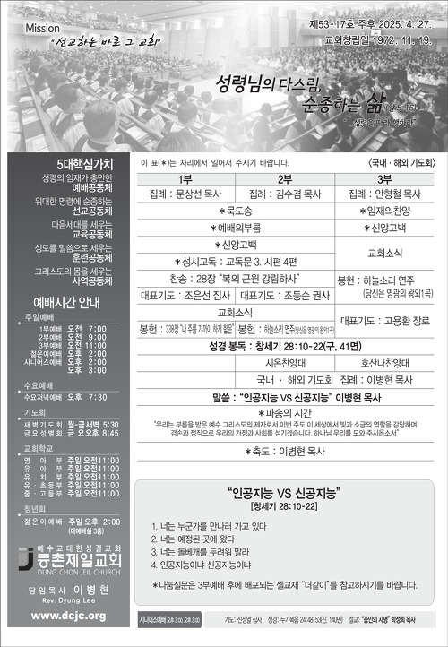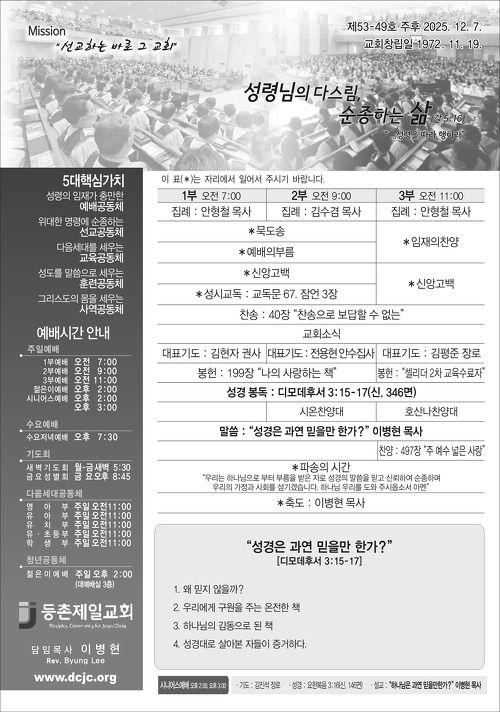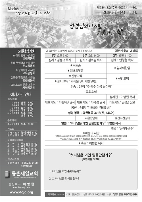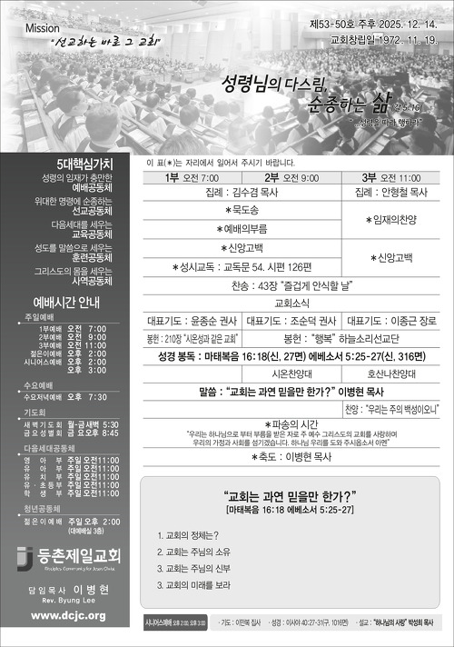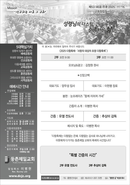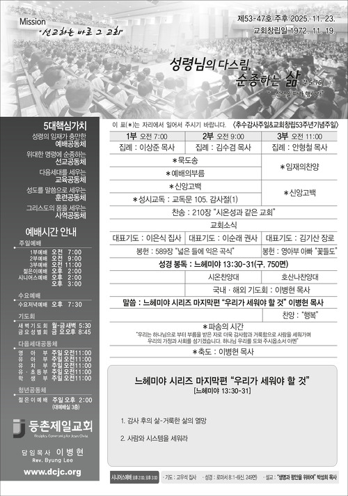 본문영역바로가기 About Us 하나님의 뜻과 함께하는 등촌제일교회 등촌제일교회는 1972년 창립되어 낙도와 농어촌에 54교회를 개척하여 후원하며, 지역사회를 위한 봉사와 교육활동을 통하여 선교와 교육에 주력하여 성장하는 교회입니다. 여러분과 여러분의 가정에 하나님의 평강이 넘치시길 기원합니다. 언제든지 찾아주십시오. 여러분을 진심으로 환영합니다. 예배시간 안내 다양한 예배장소와 시간을 안내합니다. 공지사항 등촌제일교회의 공지사항을 확인하세요. 찾아오시는 길 찾아오시는 모든 분들 환영합니다. 교회 갤러리 새가족과 행사 사진들을 보실 수 있습니다. 주보 안내 주보보기 2025-12-12 12월 14일 주보 주보보기 2025-12-05 12월 7일 주보 주보보기 2025-11-28 11월 30일 주보 주보보기 2025-11-21 11월 23일 주보 주보보기 2025-11-14 11월 16일 주보 주보보기 2025-11-07 11월 9일 주보 주일설교