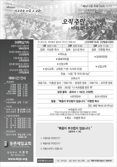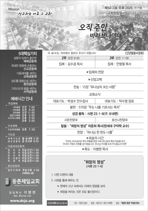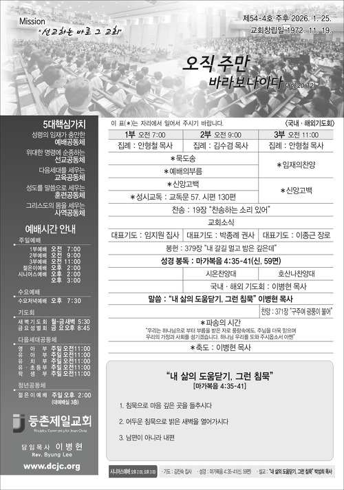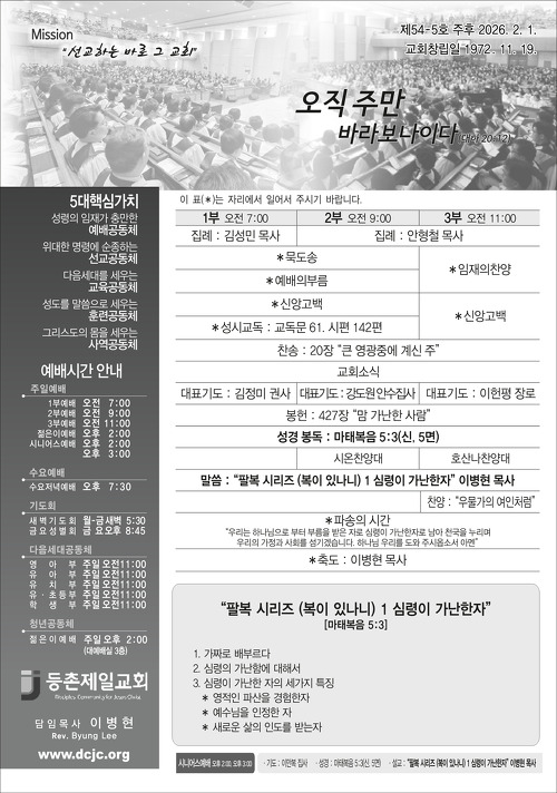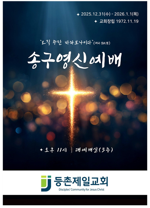 본문영역바로가기 About Us 하나님의 뜻과 함께하는 등촌제일교회 등촌제일교회는 1972년 창립되어 낙도와 농어촌에 54교회를 개척하여 후원하며, 지역사회를 위한 봉사와 교육활동을 통하여 선교와 교육에 주력하여 성장하는 교회입니다. 여러분과 여러분의 가정에 하나님의 평강이 넘치시길 기원합니다. 언제든지 찾아주십시오. 여러분을 진심으로 환영합니다. 예배시간 안내 다양한 예배장소와 시간을 안내합니다. 공지사항 등촌제일교회의 공지사항을 확인하세요. 찾아오시는 길 찾아오시는 모든 분들 환영합니다. 교회 갤러리 새가족과 행사 사진들을 보실 수 있습니다. 주보 안내 주보보기 2026-01-31 2월 1일 주보 주보보기 2026-01-23 1월 25일 주보 주보보기 2026-01-16 1월 18일 주보 주보보기 2026-01-09 1월 11일 주보 주보보기 2025-12-31 2026년 1월 4일 주보 주보보기 2025-12-31 2025 송구영신예배 25.12.31(수) 주일설교