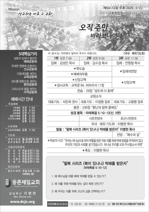 본문영역바로가기 About Us 하나님의 뜻과 함께하는 등촌제일교회 등촌제일교회는 1972년 창립되어 낙도와 농어촌에 54교회를 개척하여 후원하며, 지역사회를 위한 봉사와 교육활동을 통하여 선교와 교육에 주력하여 성장하는 교회입니다. 여러분과 여러분의 가정에 하나님의 평강이 넘치시길 기원합니다. 언제든지 찾아주십시오. 여러분을 진심으로 환영합니다. 예배시간 안내 다양한 예배장소와 시간을 안내합니다. 공지사항 등촌제일교회의 공지사항을 확인하세요. 찾아오시는 길 찾아오시는 모든 분들 환영합니다. 교회 갤러리 새가족과 행사 사진들을 보실 수 있습니다. 주보 안내 주보보기 2026-04-17 4월 19일 주보 주보보기 2026-04-10 4월 12일 주보 주보보기 2026-04-03 4월 5일 부활절 주보 주보보기 2026-04-03 4월 3일(금) 聖금요특별예배 주보보기 2026-03-27 3월 29일 주보 주보보기 2026-03-20 3월 22일 주보 주일설교