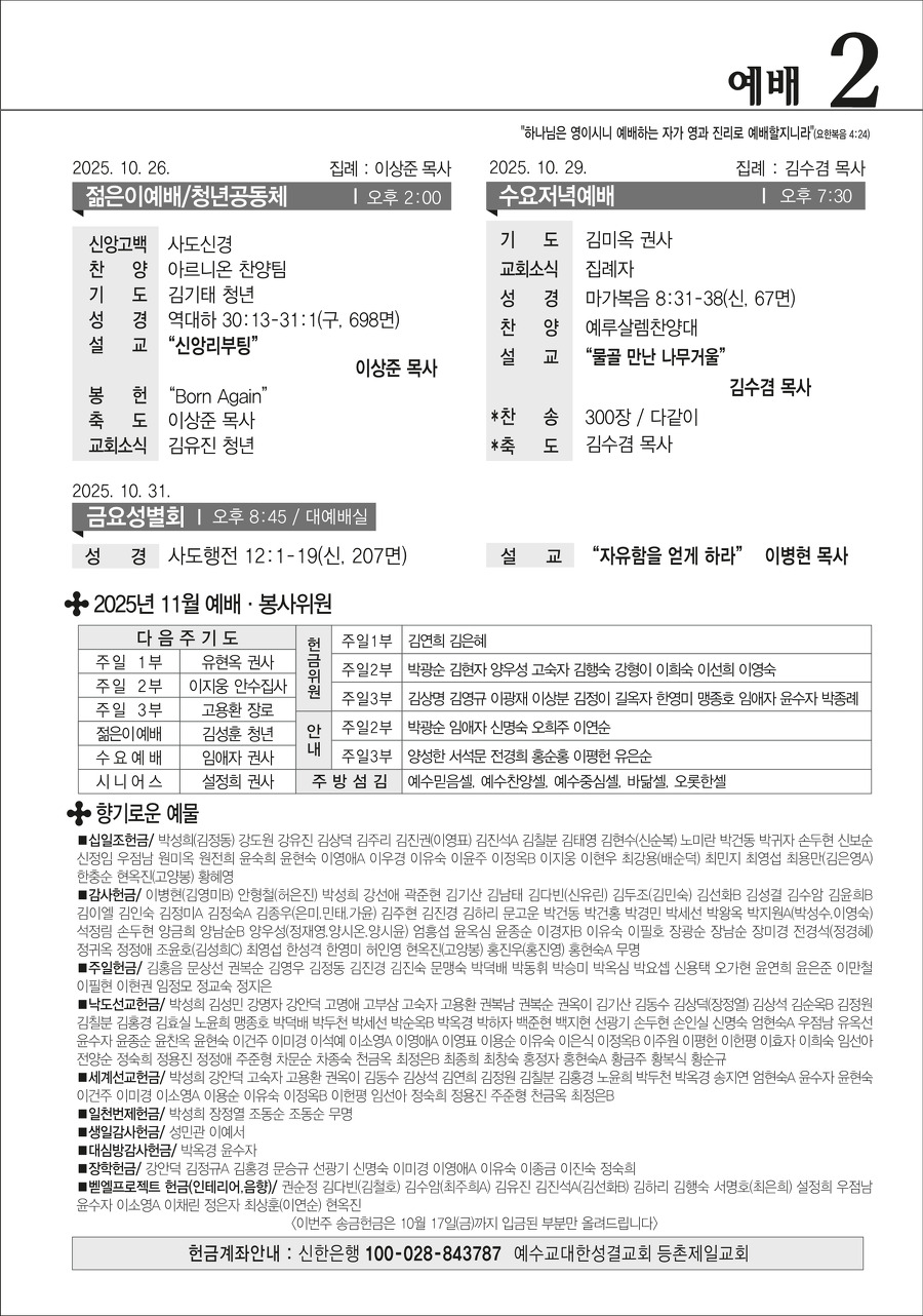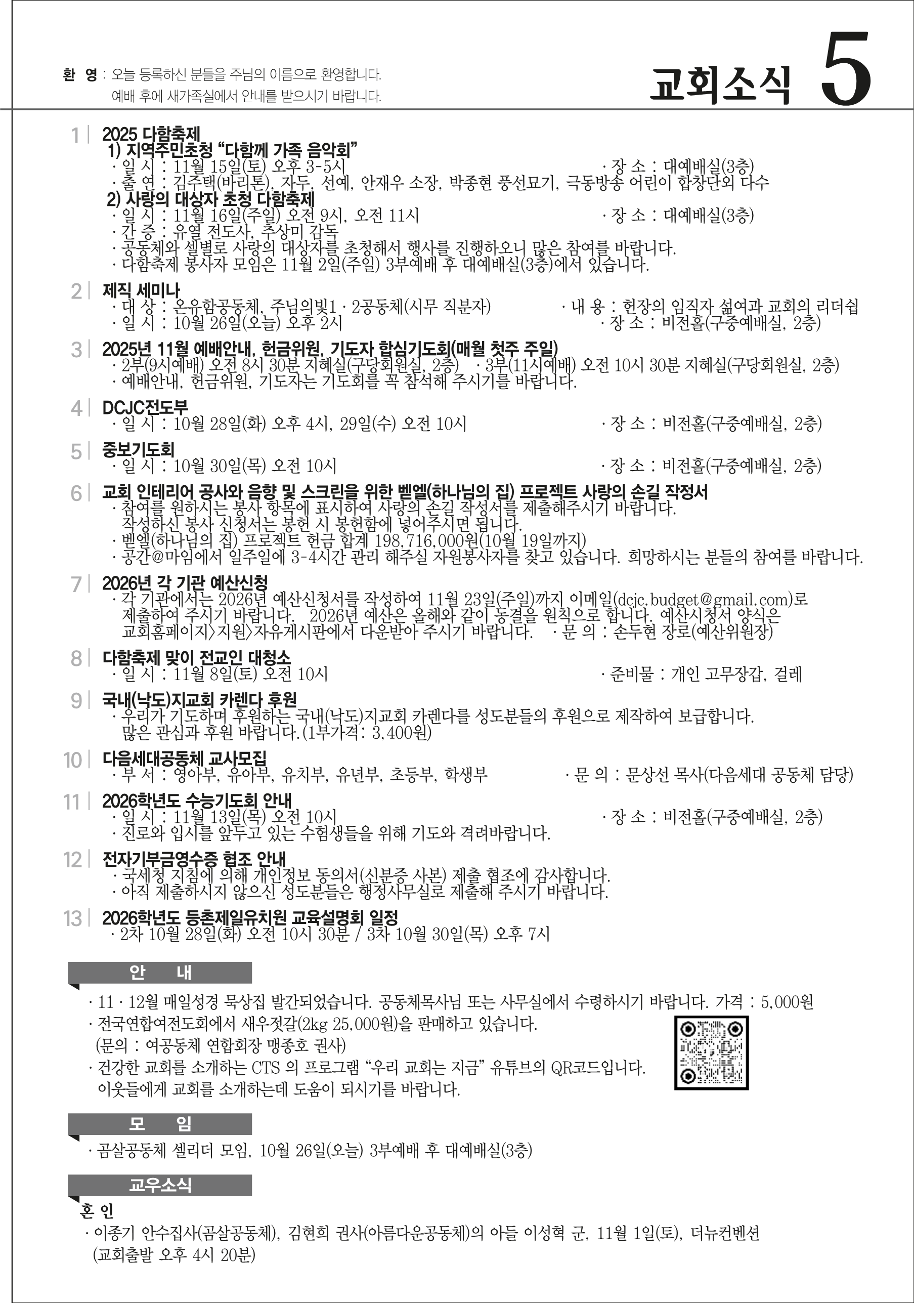 본문영역 교회소식 News 공지사항 주보보기 갤러리 새가족소개 교회소식주보보기 주보보기 10월 26일 주보 작성자 : 행정간사 작성일 : 2025-10-25 조회수 : 420 첨부파일 7개 10-26_등촌제일교회_주보_신예향_(9)_1.png10-26_등촌제일교회_주보_신예향_(9)_2.png10-26_등촌제일교회_주보_신예향_(9)_3.png10-26_등촌제일교회_주보_신예향_(9)_4.png10-26_등촌제일교회_주보_신예향_(9)_5.png10-26_등촌제일교회_주보_신예향_(9)_6.png10-26_등촌제일교회_주보_신예향_(9).pdf 목록으로