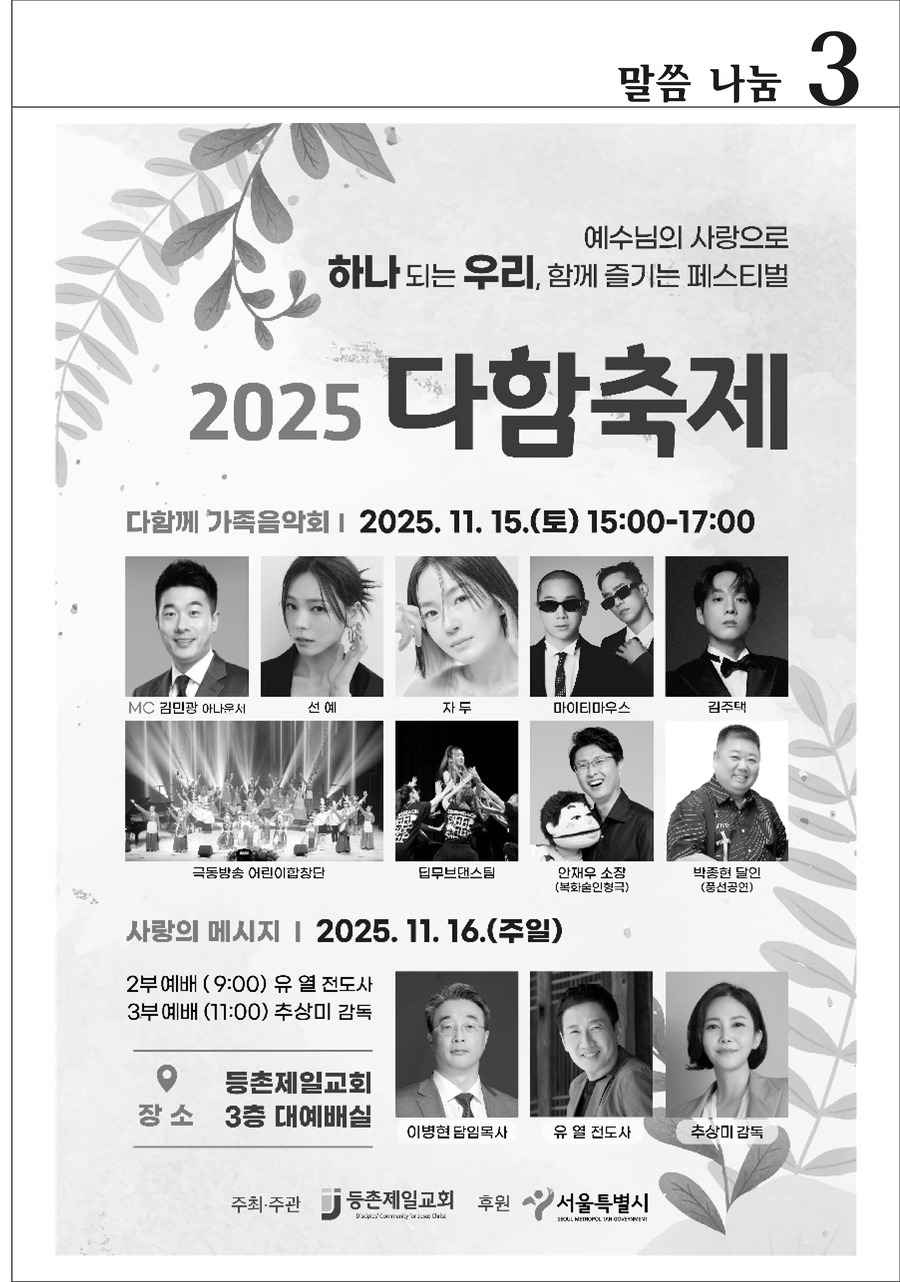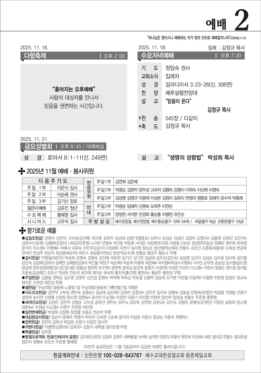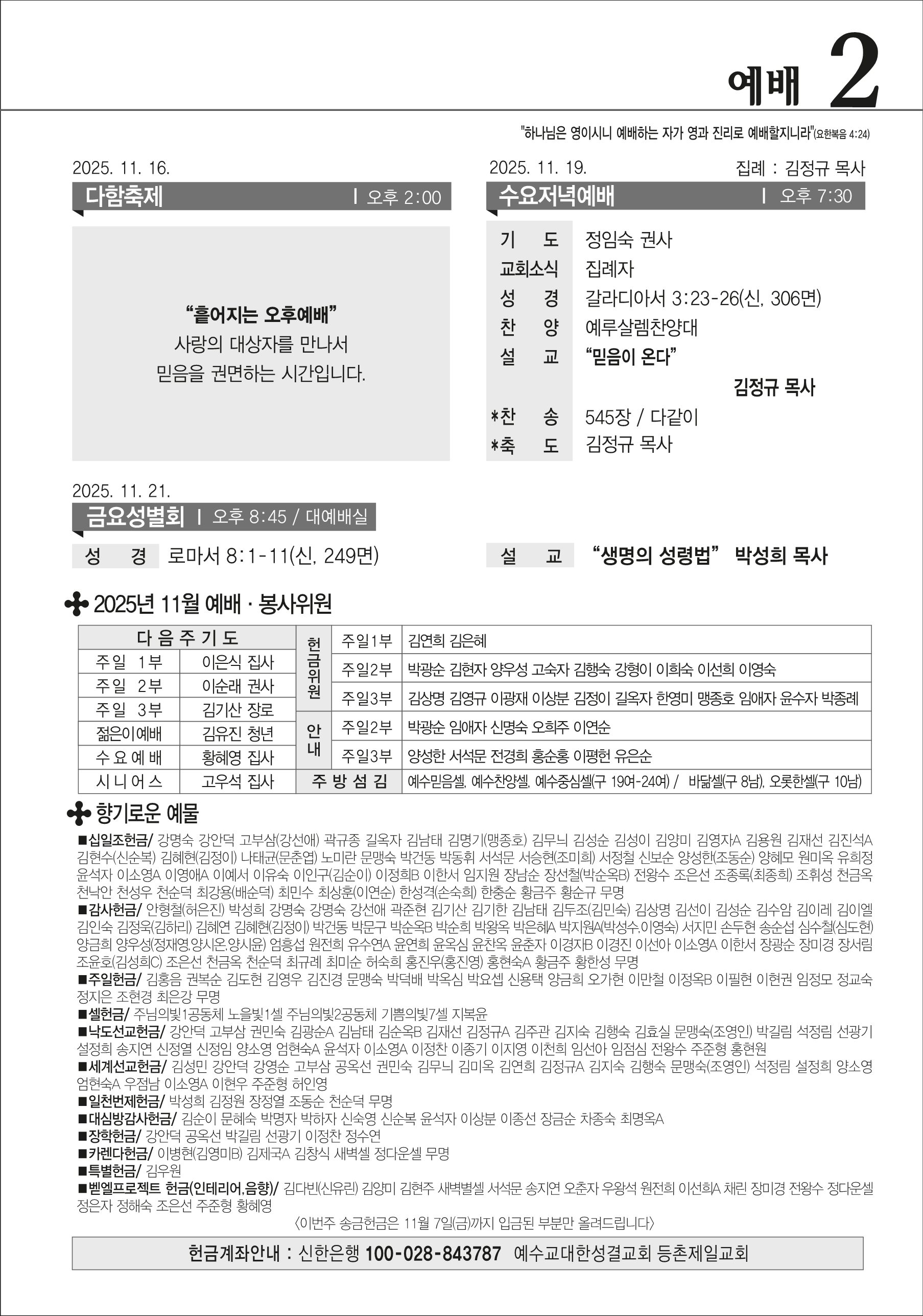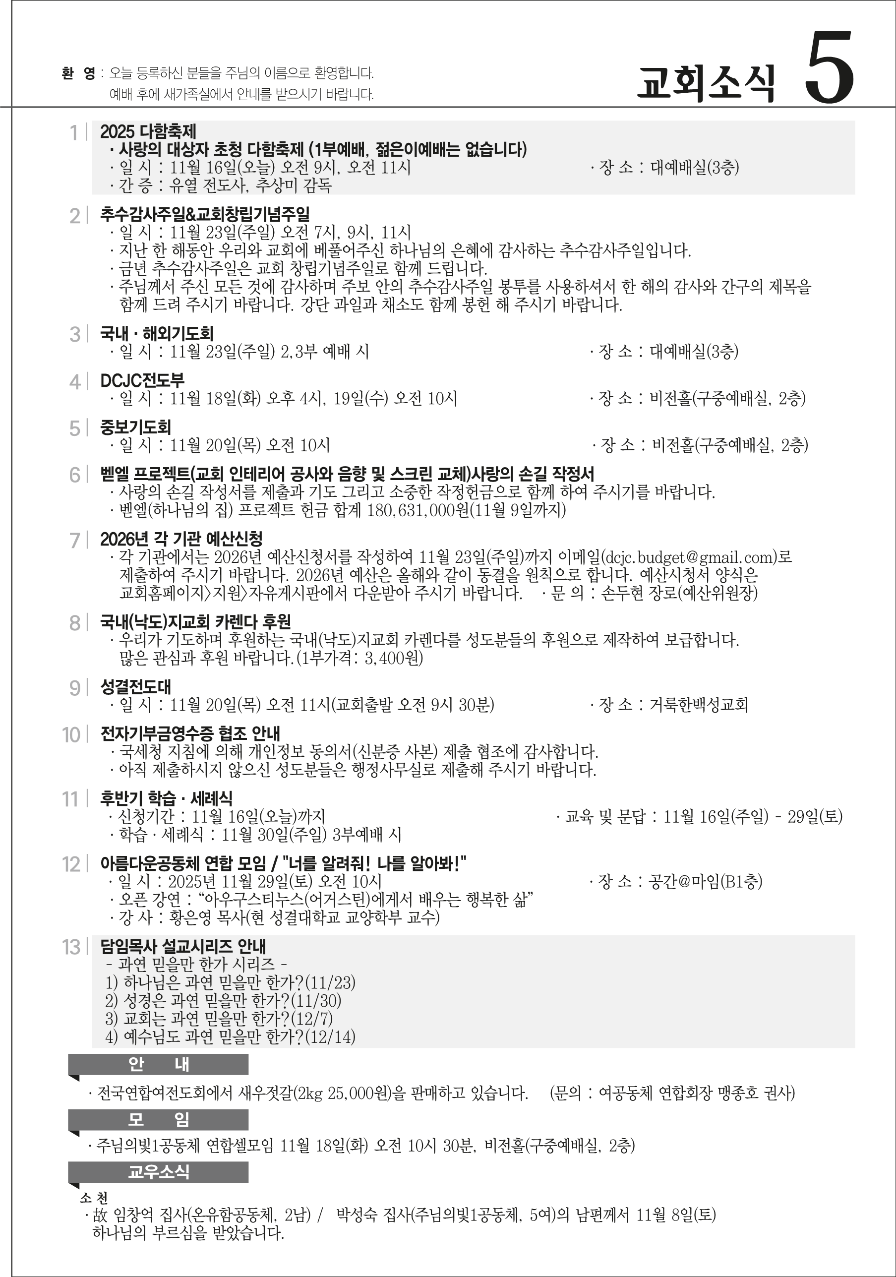 본문영역 교회소식 News 공지사항 주보보기 갤러리 새가족소개 교회소식주보보기 주보보기 11월 16일 주보 작성자 : 행정간사 작성일 : 2025-11-14 조회수 : 334 첨부파일 6개 11-16_등촌제일교회_주보_신예향_(9)_1.png11-16_등촌제일교회_주보_신예향_(9)_2.png11-16_등촌제일교회_주보_신예향_(9)_3.png11-16_등촌제일교회_주보_신예향_(9)_4.png11-16_등촌제일교회_주보_신예향_(9)_5.png11-16_등촌제일교회_주보_신예향_(9)_6.png 목록으로