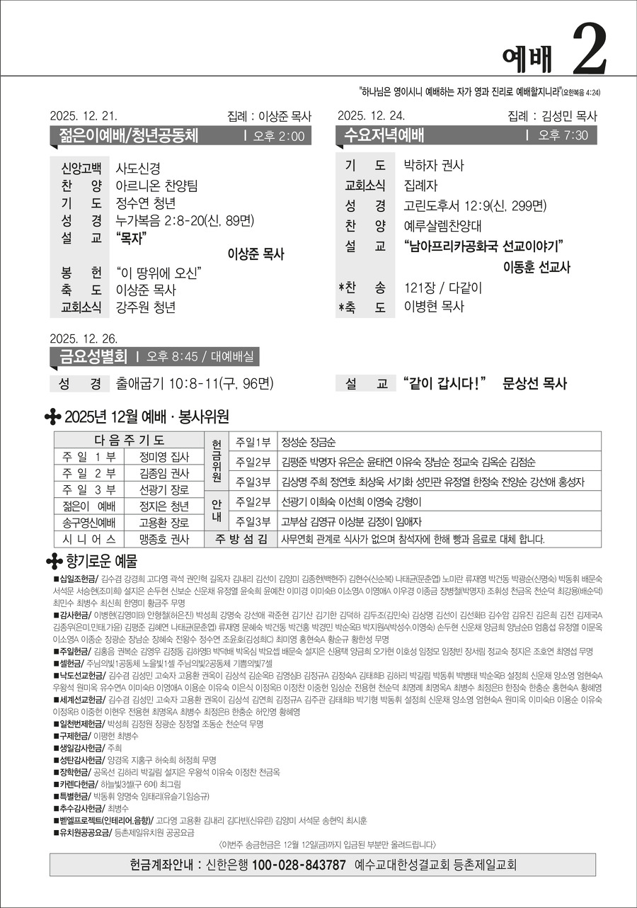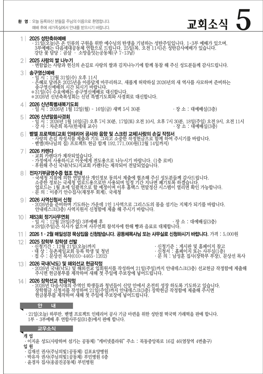 본문영역 교회소식 News 공지사항 주보보기 갤러리 새가족소개 교회소식주보보기 주보보기 12월 21일 주보 작성자 : 행정간사 작성일 : 2025-12-19 조회수 : 73 첨부파일 7개 12-21_등촌제일교회_주보_신예향_(10)_1.png12-21_등촌제일교회_주보_신예향_(10)_2.png12-21_등촌제일교회_주보_신예향_(10)_3.png12-21_등촌제일교회_주보_신예향_(10)_4.png12-21_등촌제일교회_주보_신예향_(10)_5.png12-21_등촌제일교회_주보_신예향_(10)_6.png12-21_등촌제일교회_주보_신예향_(10).pdf 목록으로