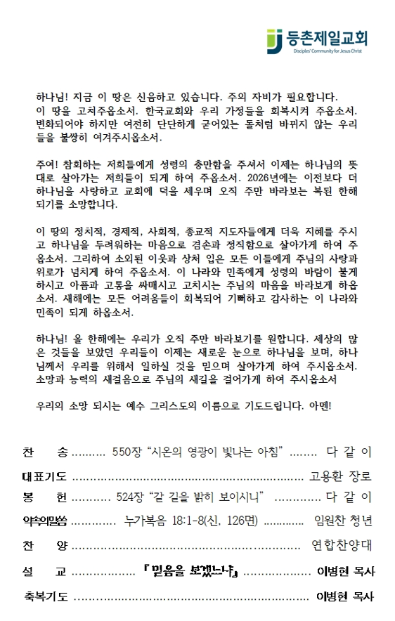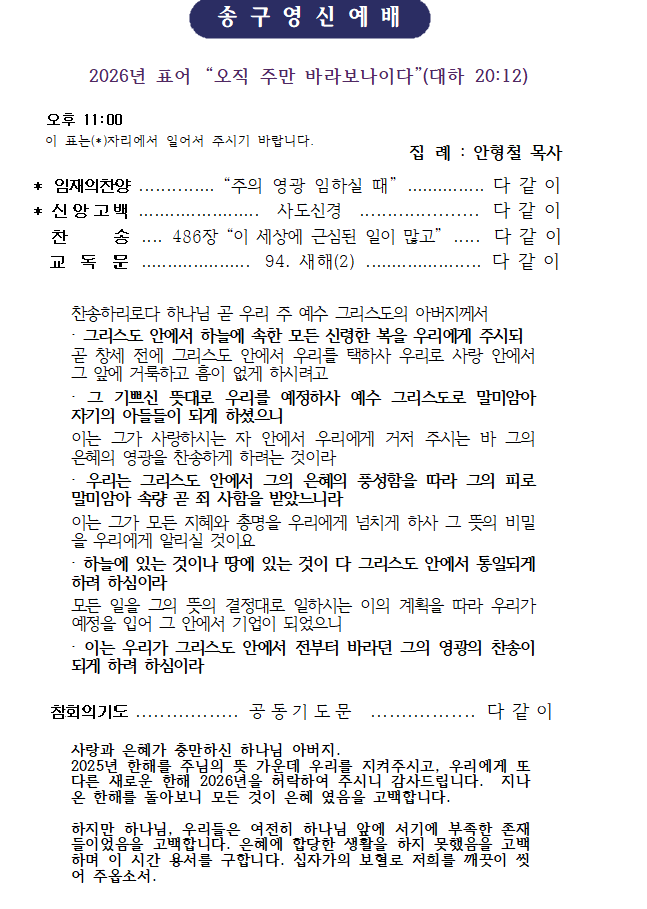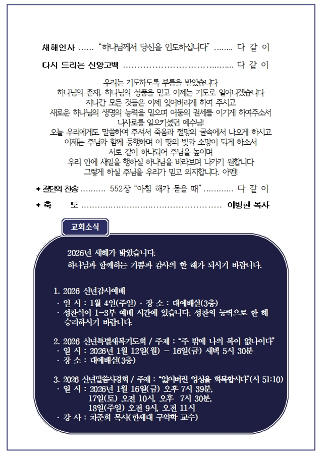 본문영역 교회소식 News 공지사항 주보보기 갤러리 새가족소개 교회소식주보보기 주보보기 2025 송구영신예배 25.12.31(수) 작성자 : 행정간사 작성일 : 2025-12-31 조회수 : 176 첨부파일 5개 스크린샷_2025-12-31_144946.png스크린샷_2025-12-31_153754.png스크린샷_2025-12-31_145013.png스크린샷_2025-12-31_144953.png2026_송구영신_순서지_new.hwp 목록으로