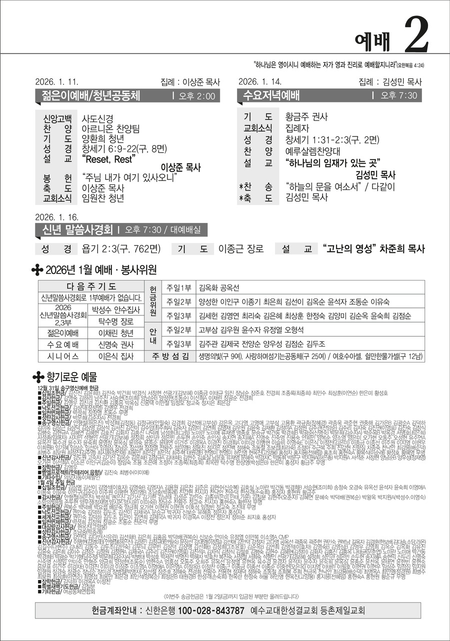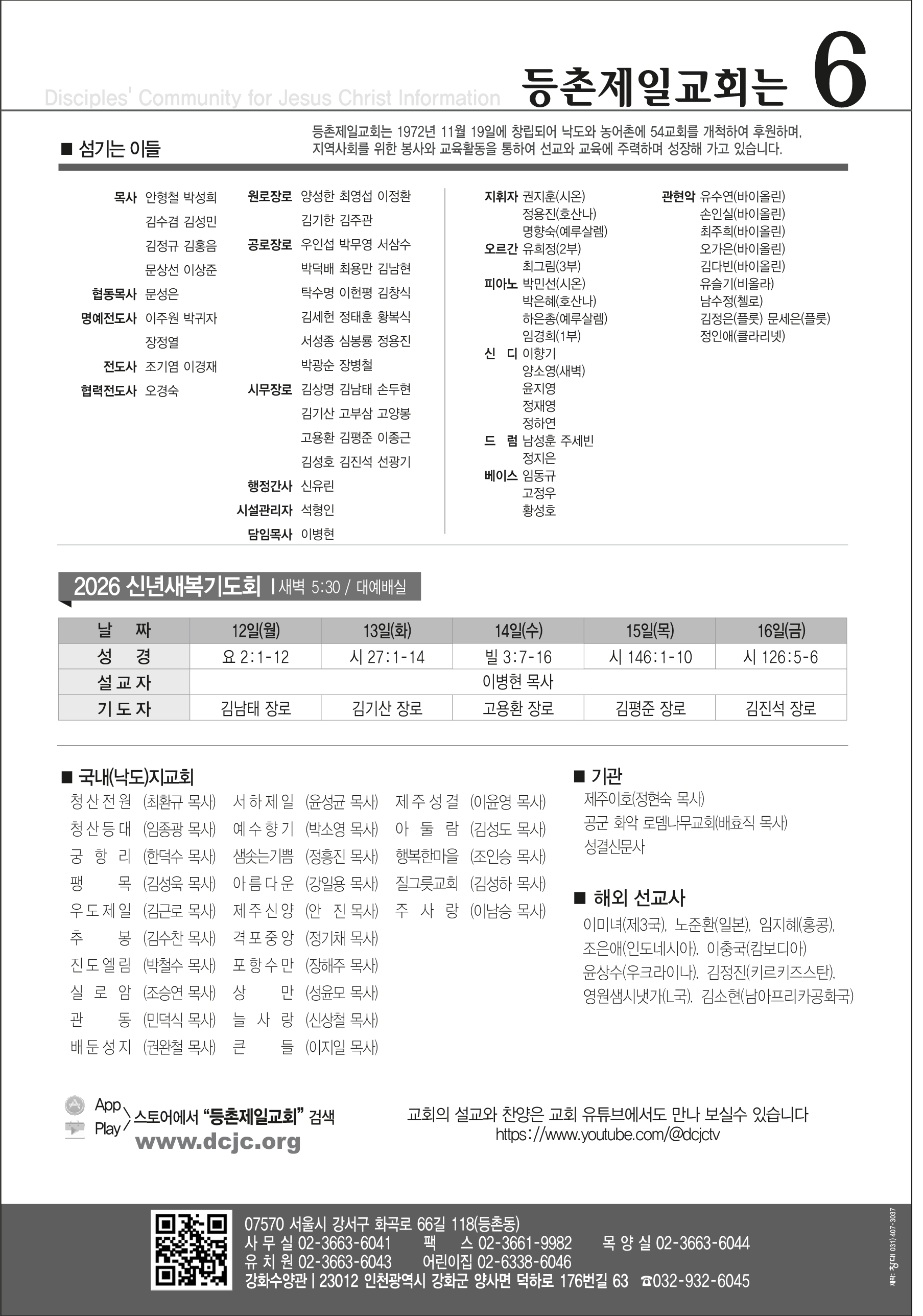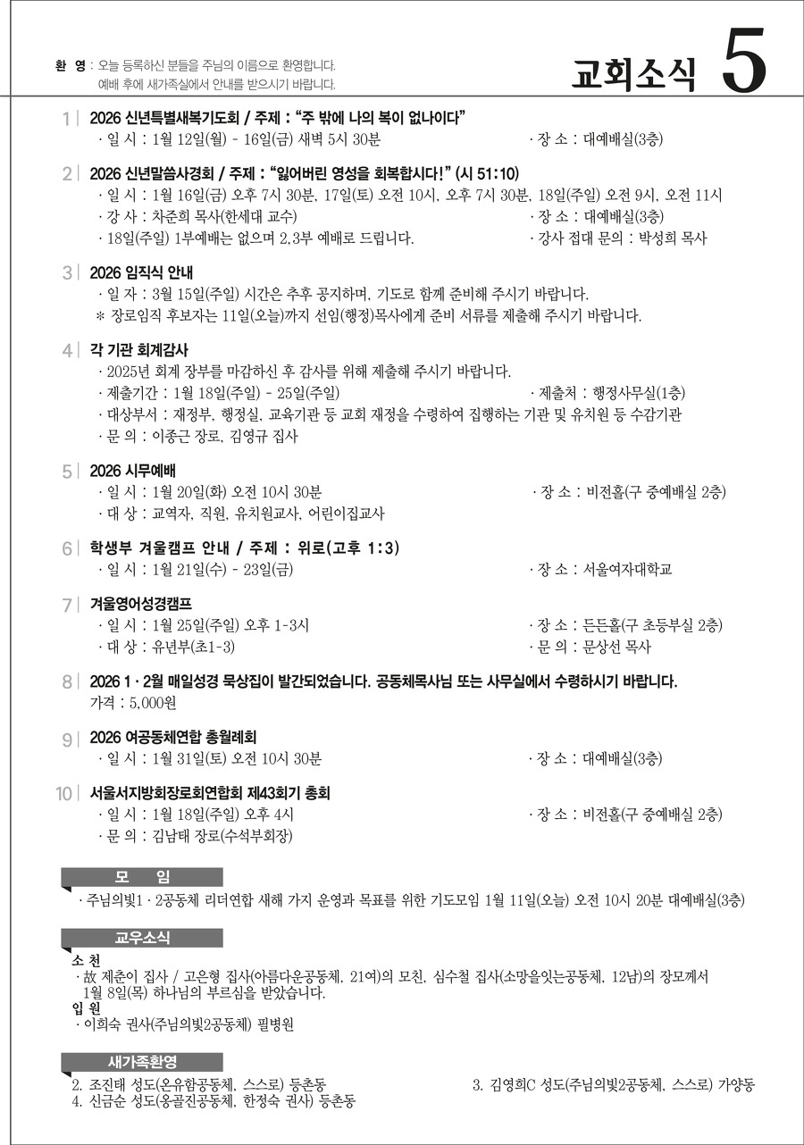 본문영역 교회소식 News 공지사항 주보보기 갤러리 새가족소개 교회소식주보보기 주보보기 1월 11일 주보 작성자 : 행정간사 작성일 : 2026-01-09 조회수 : 408 첨부파일 7개 01-11_등촌제일교회_주보_신예향_(6)_1.png01-11_등촌제일교회_주보_신예향_(6)_2.png01-11_등촌제일교회_주보_신예향_(6)_3.png01-11_등촌제일교회_주보_신예향_(6)_4.png01-11_등촌제일교회_주보_신예향_(6)_5.png01-11_등촌제일교회_주보_신예향_(6)_6.png01-11_등촌제일교회_주보_신예향_(6).pdf 목록으로