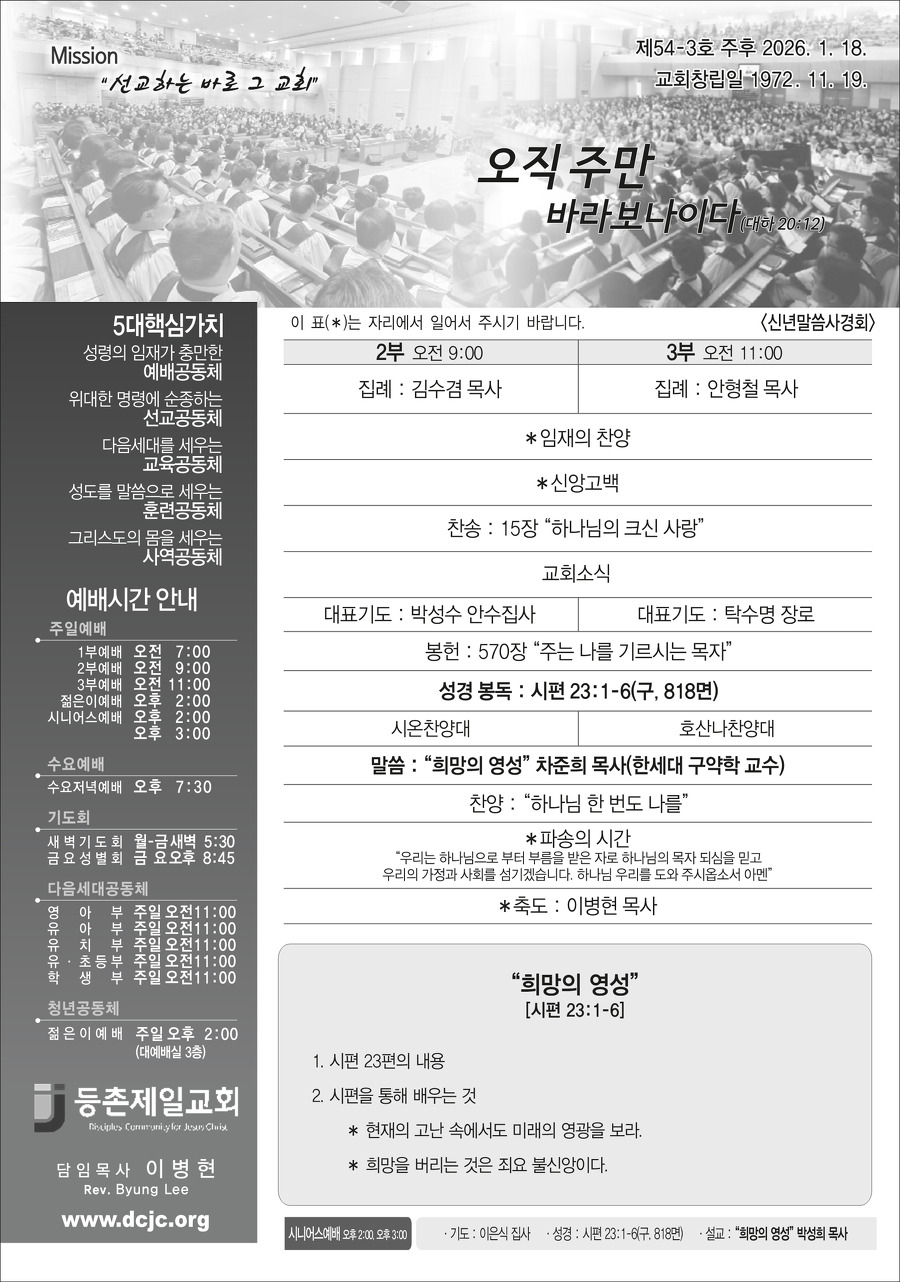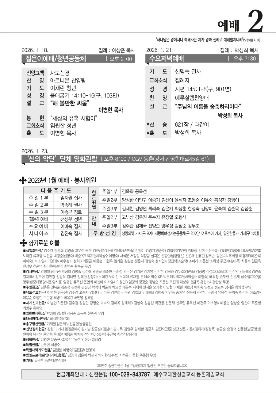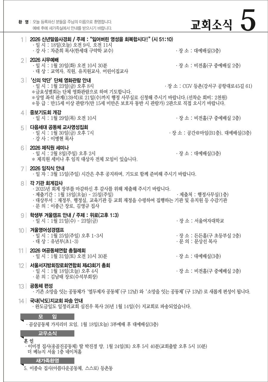 본문영역 교회소식 News 공지사항 주보보기 갤러리 새가족소개 교회소식주보보기 주보보기 1월 18일 주보 작성자 : 행정간사 작성일 : 2026-01-16 조회수 : 379 첨부파일 7개 01-18_등촌제일교회_주보_신예향_(9)_1.png01-18_등촌제일교회_주보_신예향_(9)_2.png01-18_등촌제일교회_주보_신예향_(9)_3.png01-18_등촌제일교회_주보_신예향_(9)_4.png01-18_등촌제일교회_주보_신예향_(9)_5.png01-18_등촌제일교회_주보_신예향_(9)_6.png01-18_등촌제일교회_주보_신예향_(9).pdf 목록으로