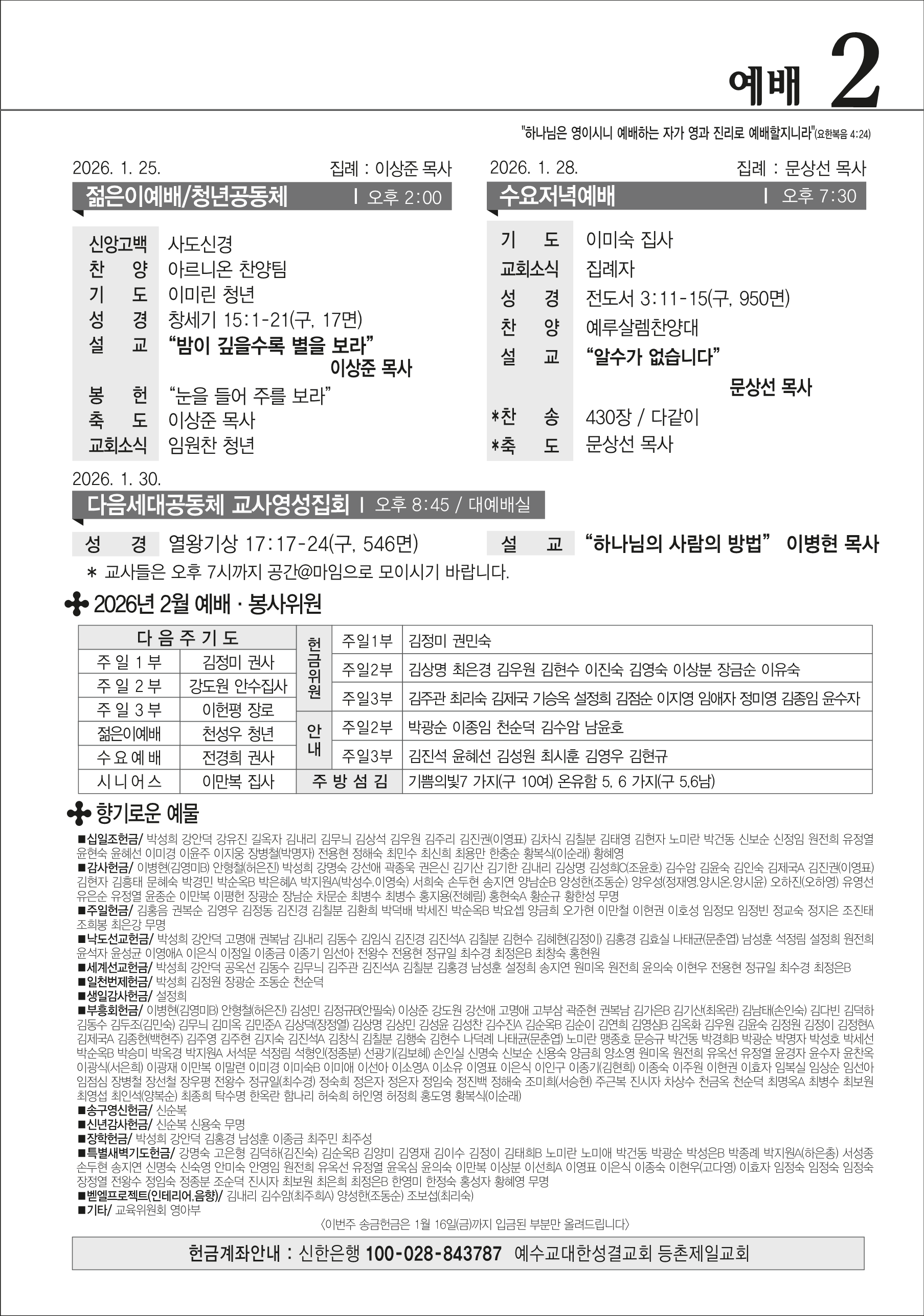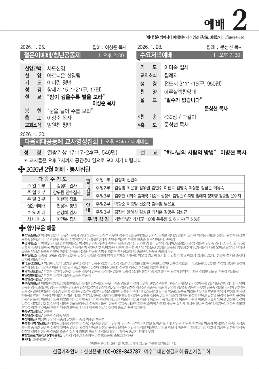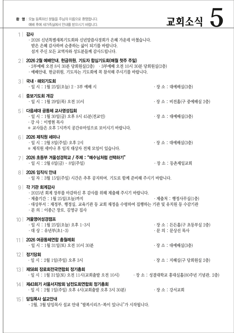 본문영역 교회소식 News 공지사항 주보보기 갤러리 새가족소개 교회소식주보보기 주보보기 1월 25일 주보 작성자 : 행정간사 작성일 : 2026-01-23 조회수 : 216 첨부파일 7개 01-25_등촌제일교회_주보_신예향_(3)_1.png01-25_등촌제일교회_주보_신예향_(3)_2.png01-25_등촌제일교회_주보_신예향_(3)_3.png01-25_등촌제일교회_주보_신예향_(3)_4.png01-25_등촌제일교회_주보_신예향_(3)_5.png01-25_등촌제일교회_주보_신예향_(3)_6.png01-25_등촌제일교회_주보_신예향_(3).pdf 목록으로