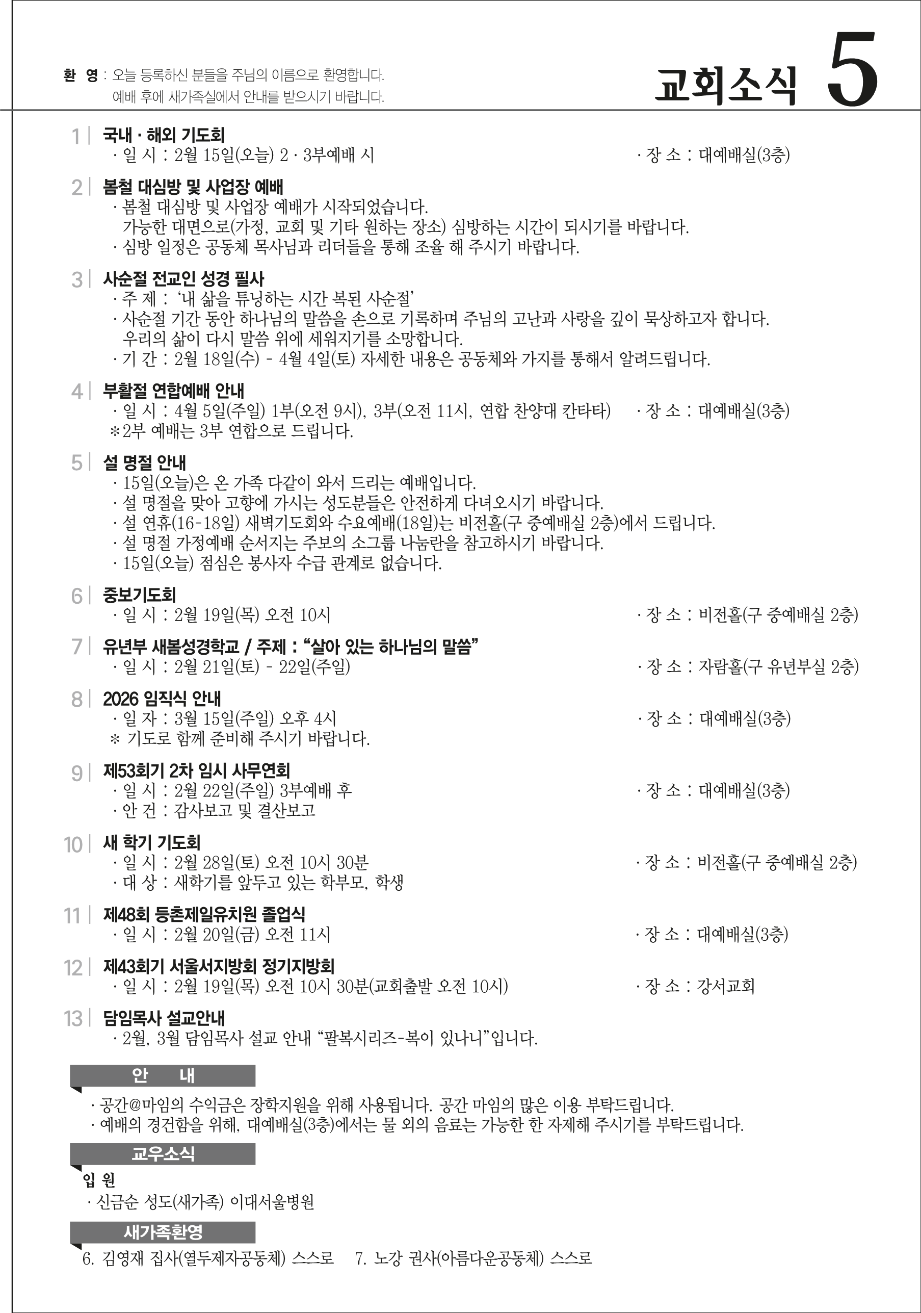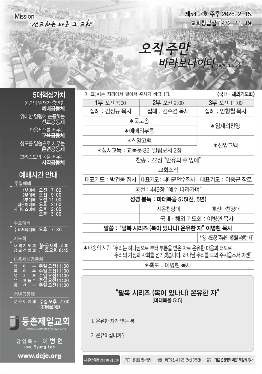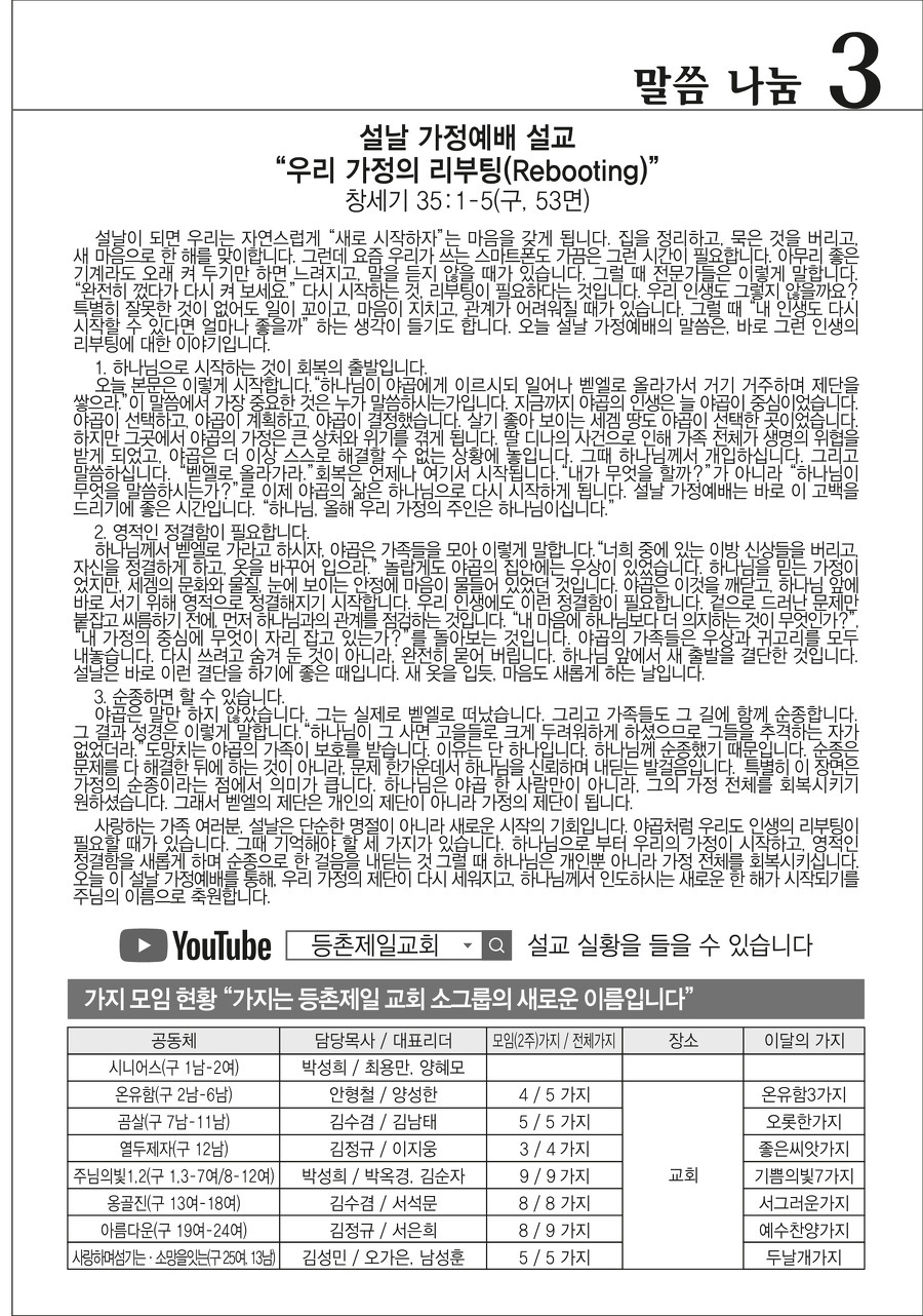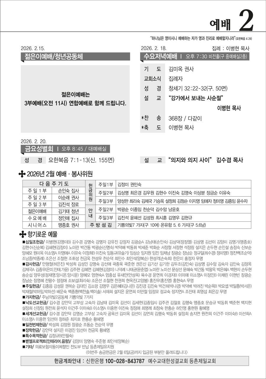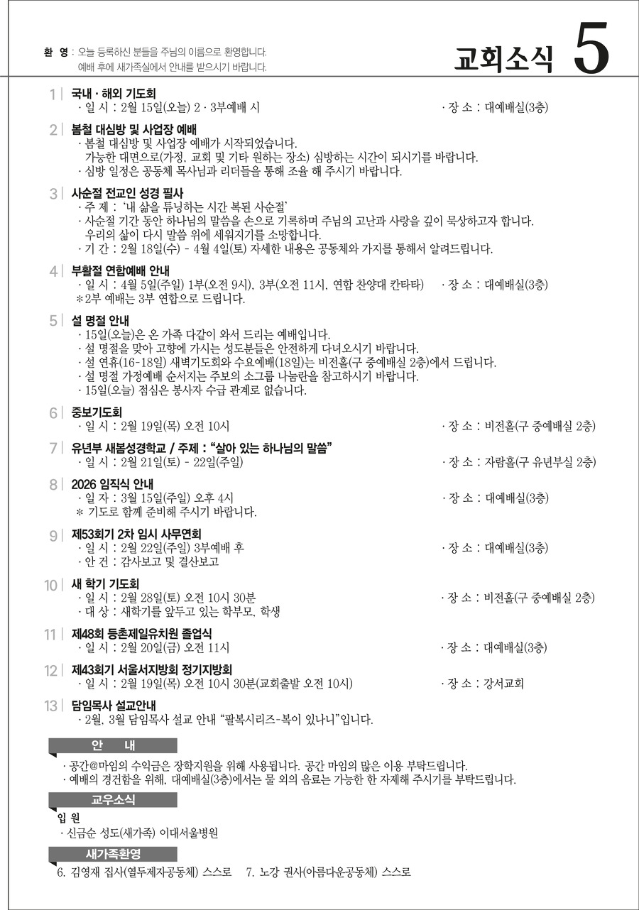 본문영역 교회소식 News 공지사항 주보보기 갤러리 새가족소개 교회소식주보보기 주보보기 2월 15일 주보 작성자 : 행정간사 작성일 : 2026-02-11 조회수 : 471 첨부파일 7개 02-15_등촌제일교회_주보_신예향_(13)_1.png02-15_등촌제일교회_주보_신예향_(13)_2.png02-15_등촌제일교회_주보_신예향_(13)_3.png02-15_등촌제일교회_주보_신예향_(13)_4.png02-15_등촌제일교회_주보_신예향_(13)_5.png02-15_등촌제일교회_주보_신예향_(13)_6.png02-15_등촌제일교회_주보_신예향_(13).pdf 목록으로